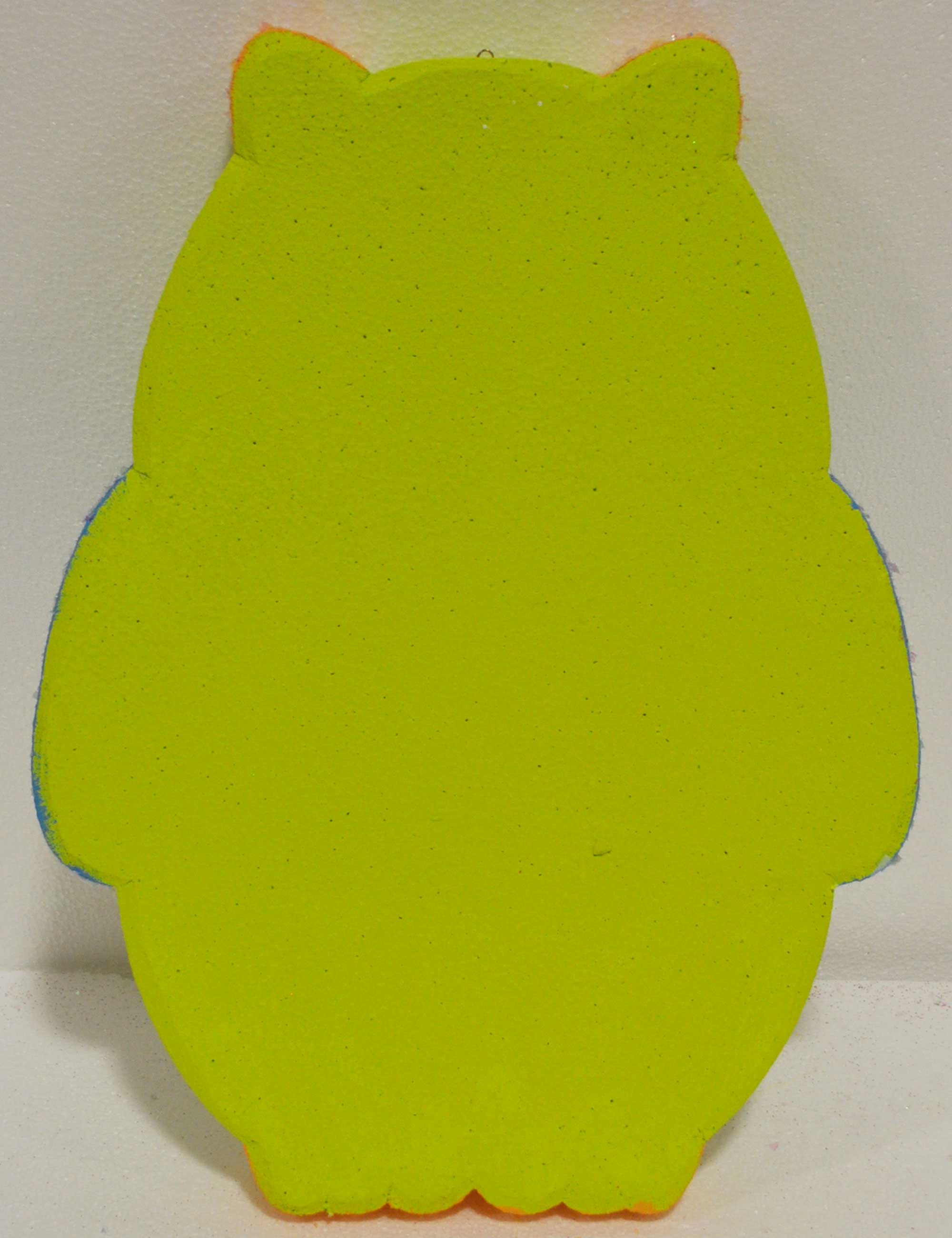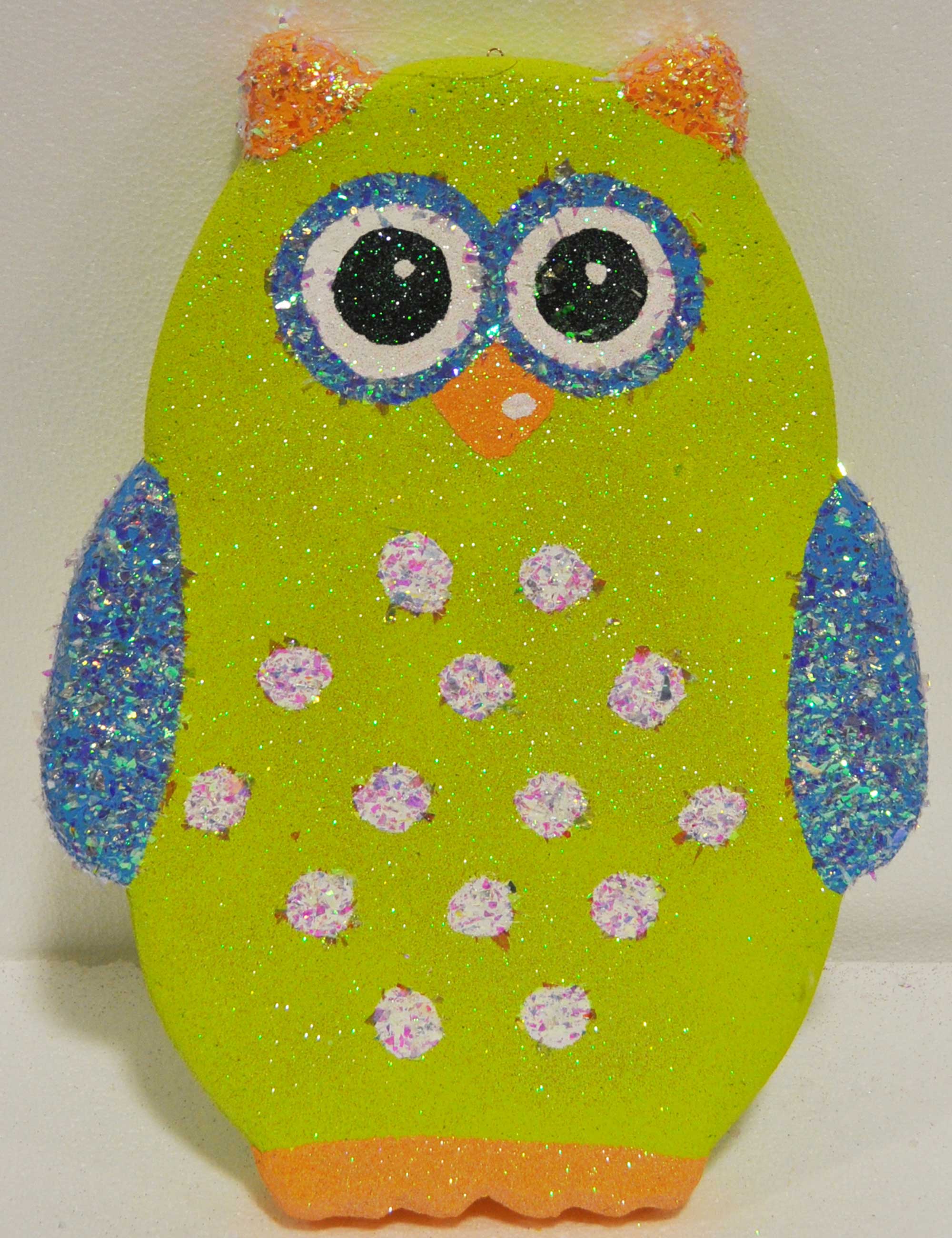Decorazione in polistirolo colorato a forma di gufo, confezionata e dipinta a mano.
