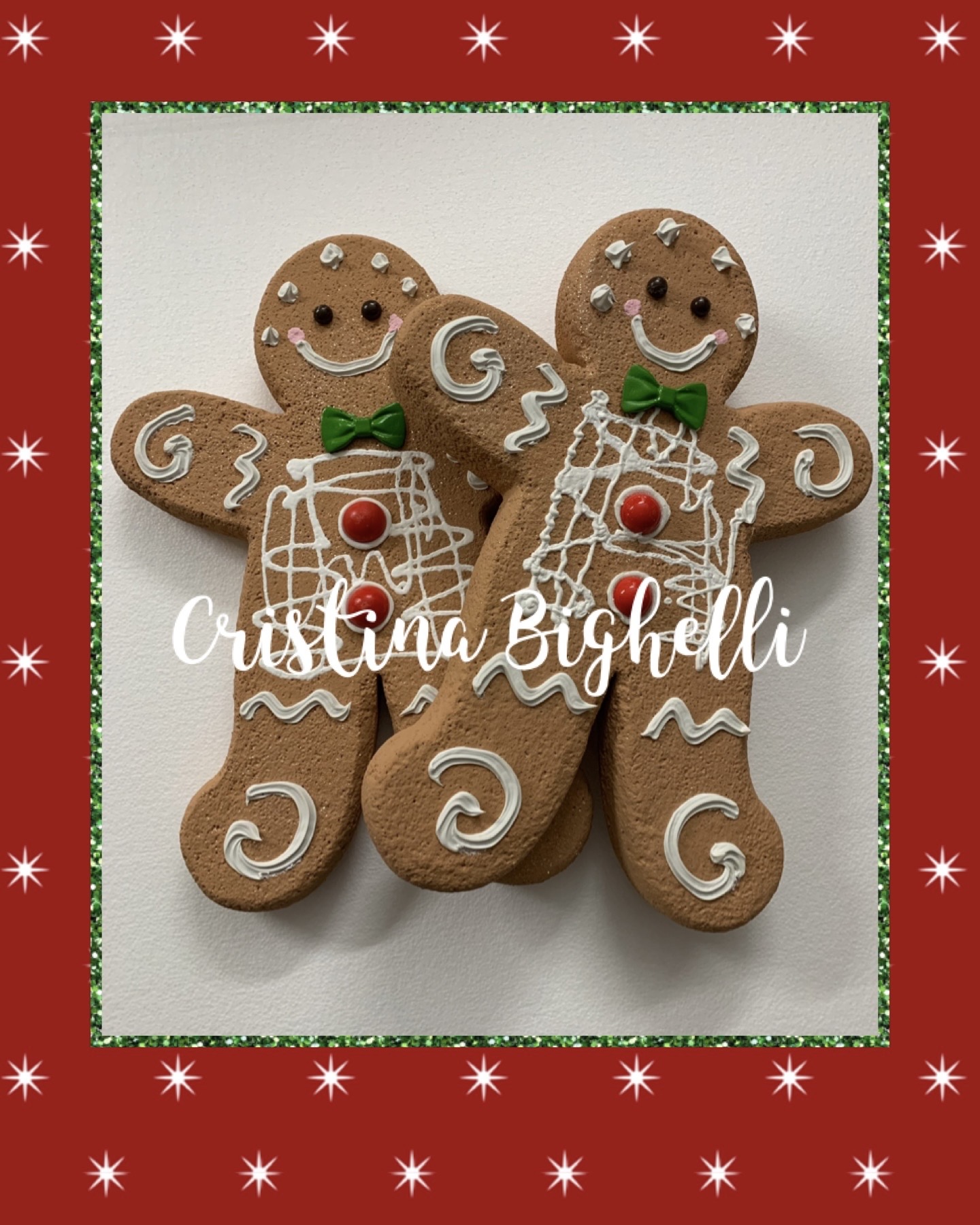 Decorazione per vetrine negozi in polistirolo a forma di omino biscotto realizzata e dipinta a mano. Colore biscotto con inserto verde e rosso.