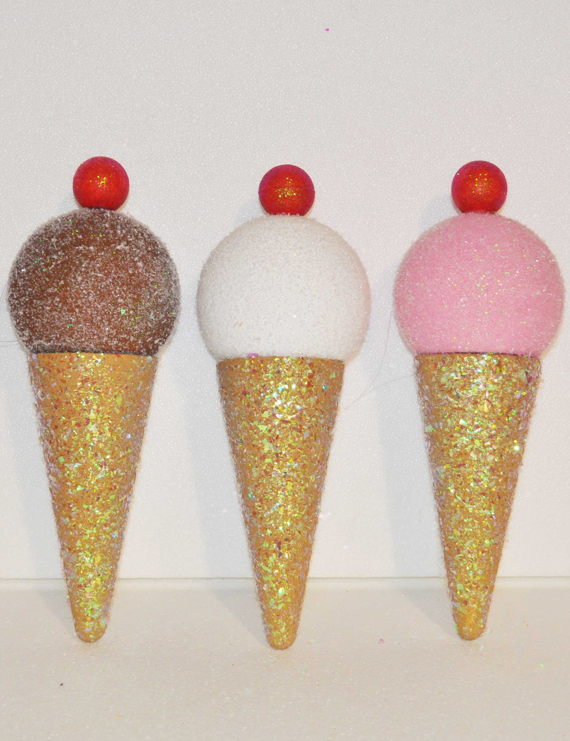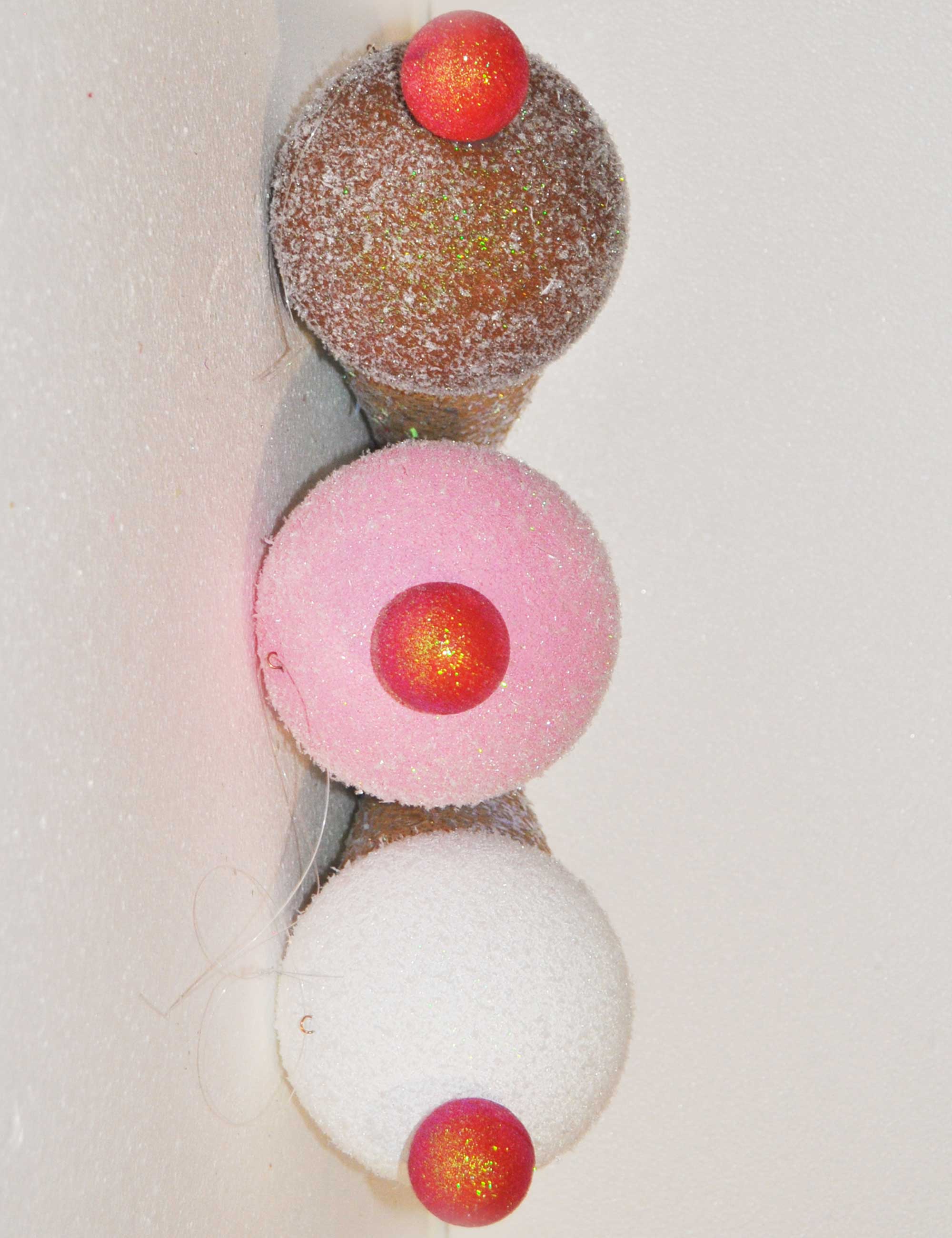 Decorazioni in polistirolo a forma di gelati, realizzate e dipinte a mano.