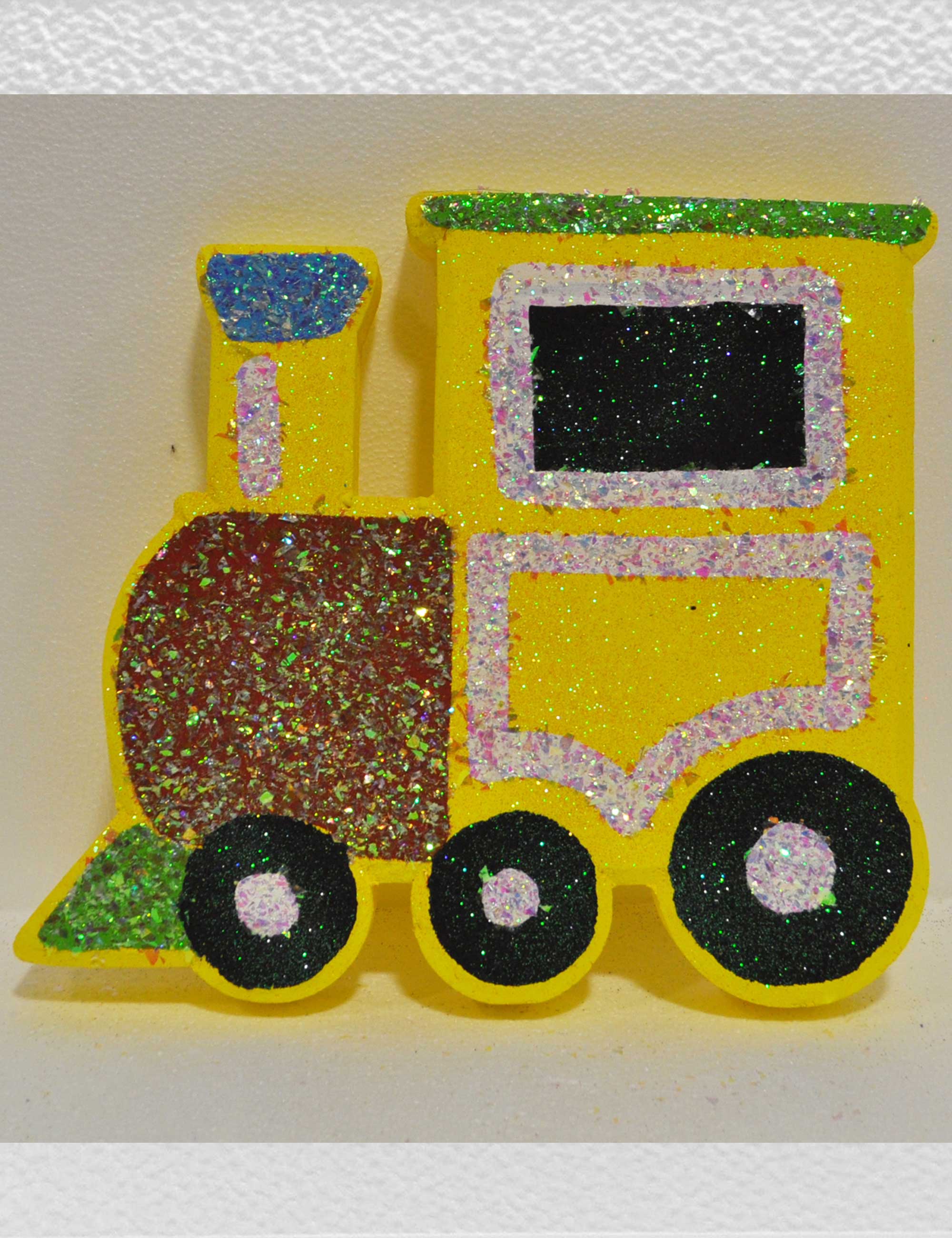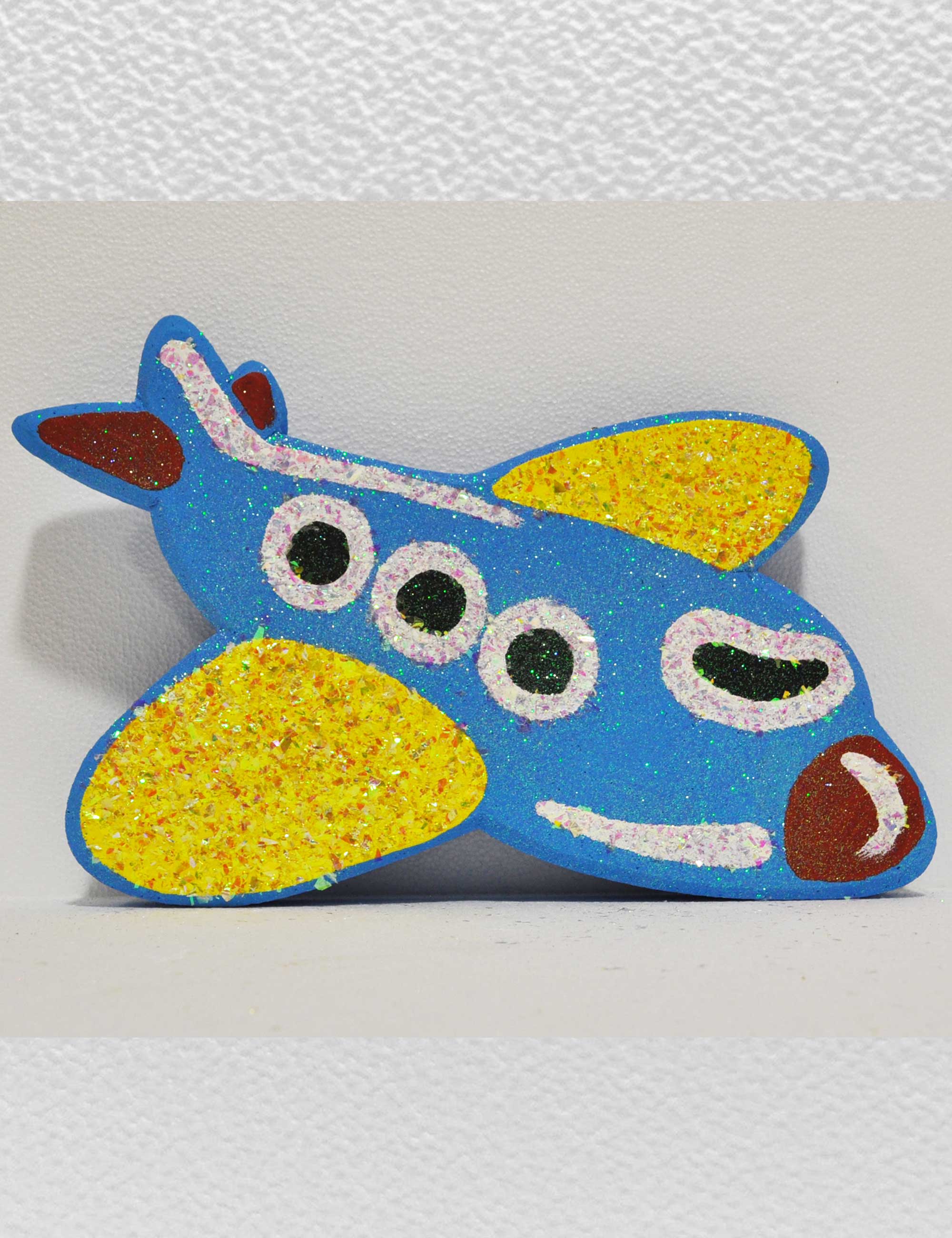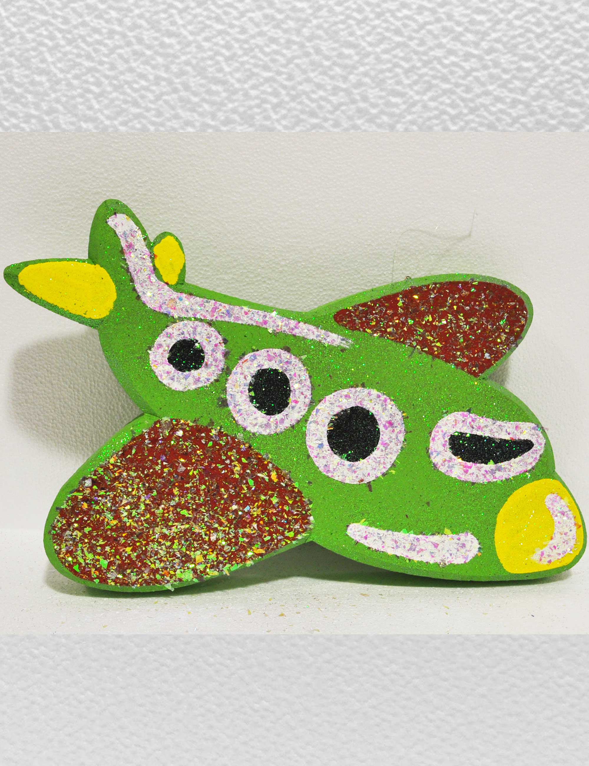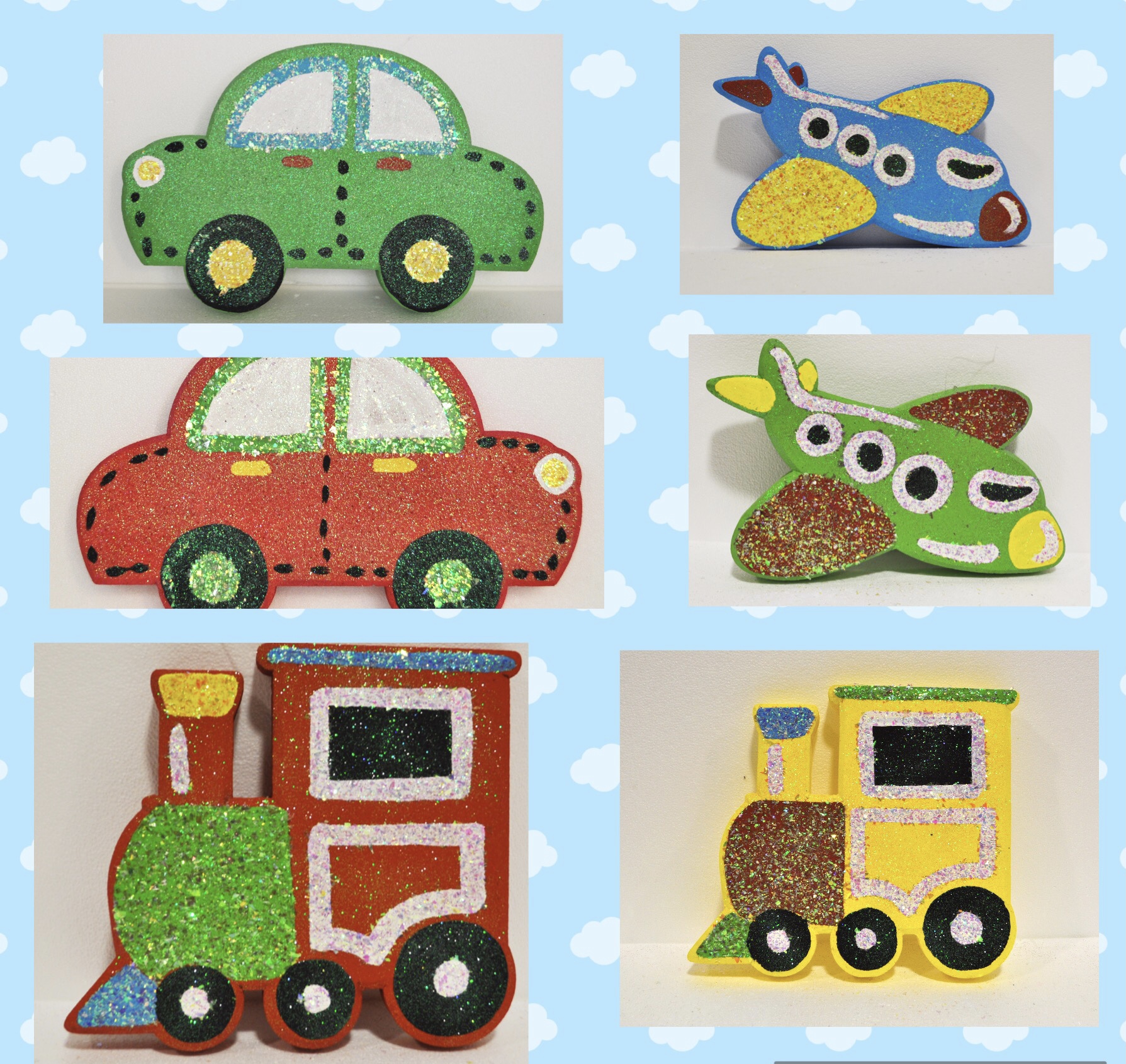 Il Kit è composto di sei pezzi in polistirolo a forma di macchinina rossa, macchinina verde, aeroplano verde, aeroplano azzurro, trenino giallo e trenino rosso.