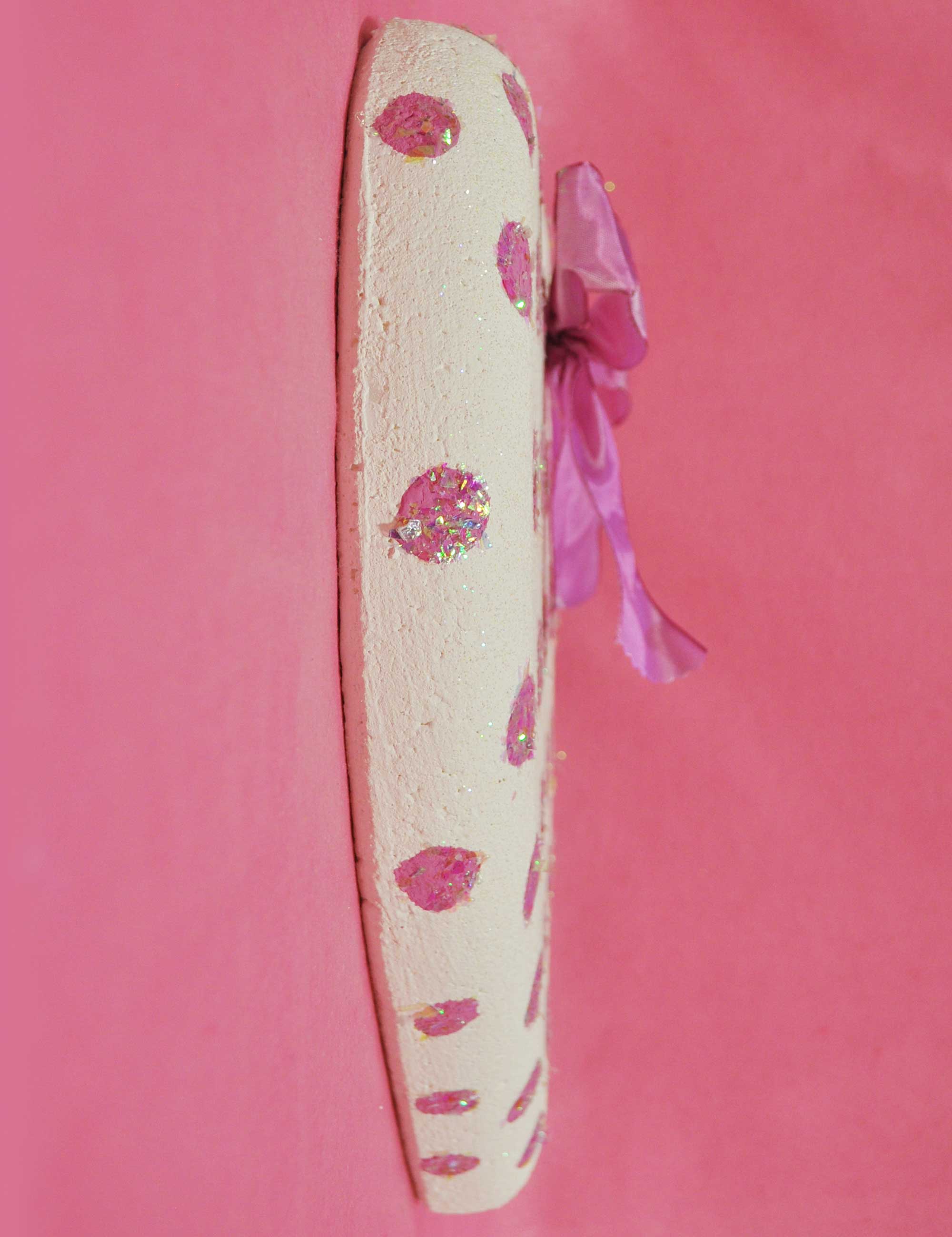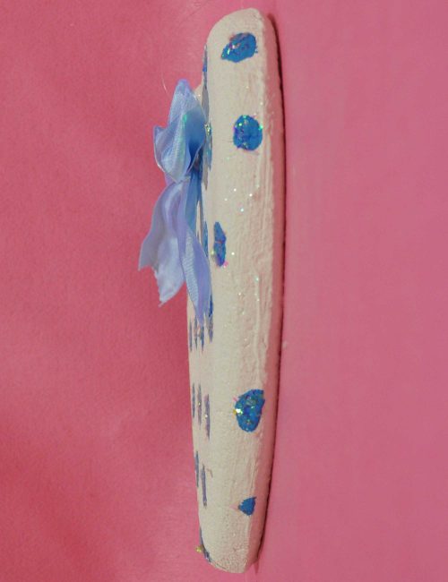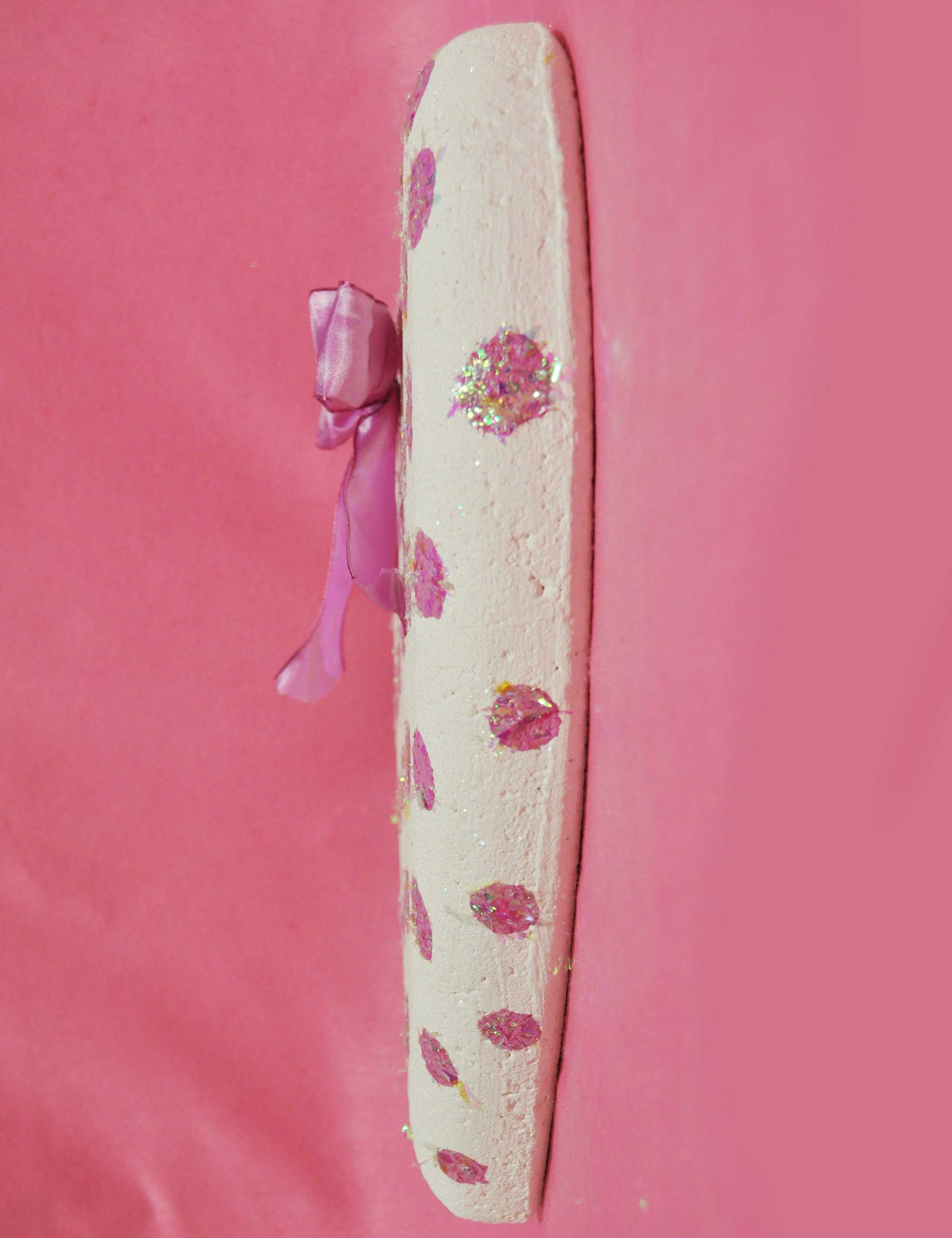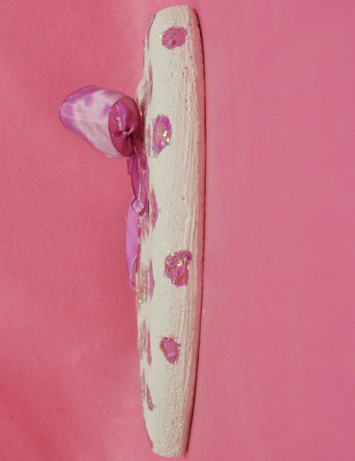 Decorazione in polistirolo a forma di fiore e fiocco applicato, realizzata e dipinta a mano.